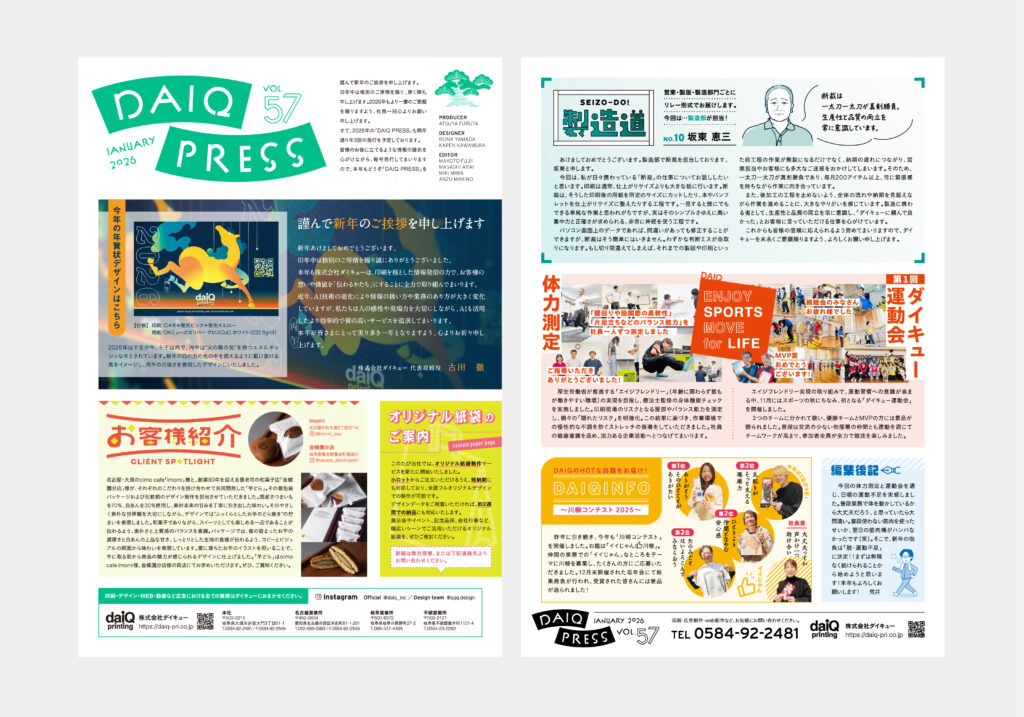 弊社が発行しております「DAIQ PRESS vol.57」を発行いたしました!今号のDAIQ PRESSは、新年のご挨拶や年賀状デザインについて、 お客様のご紹介などの内容を掲載しております。