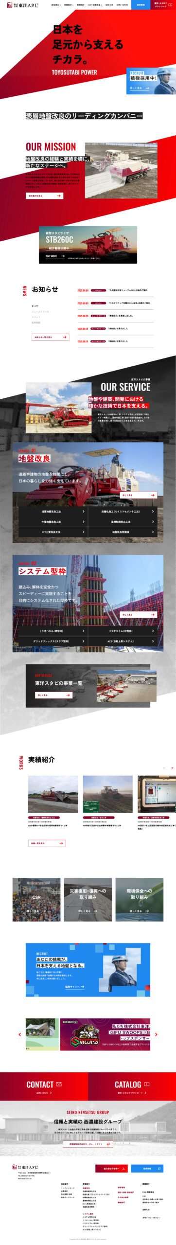 既存サイトを明るく爽やかで清潔感のあるイメージに変更したいというご要望を受け、ファーストビューではキャッチコピー「足元から」に着想を得て、地盤改良でのトップレベルの実績や、日本の建築事業を支える企業イメージを、下から上へ広がる力強い赤のモチーフで表現しました。